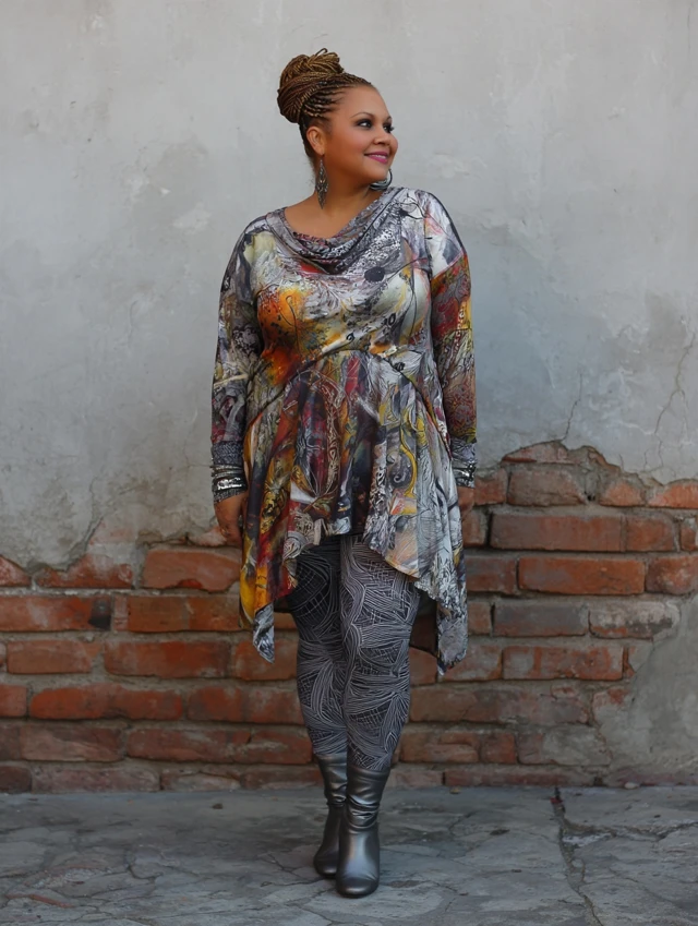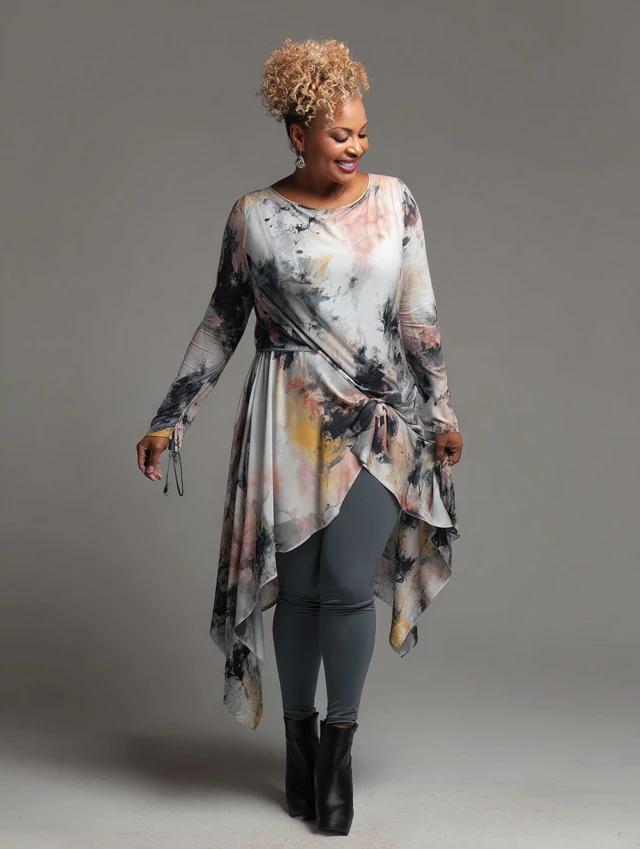 - Accessories: Statement necklaces, belts, scarves to draw the eye upward.