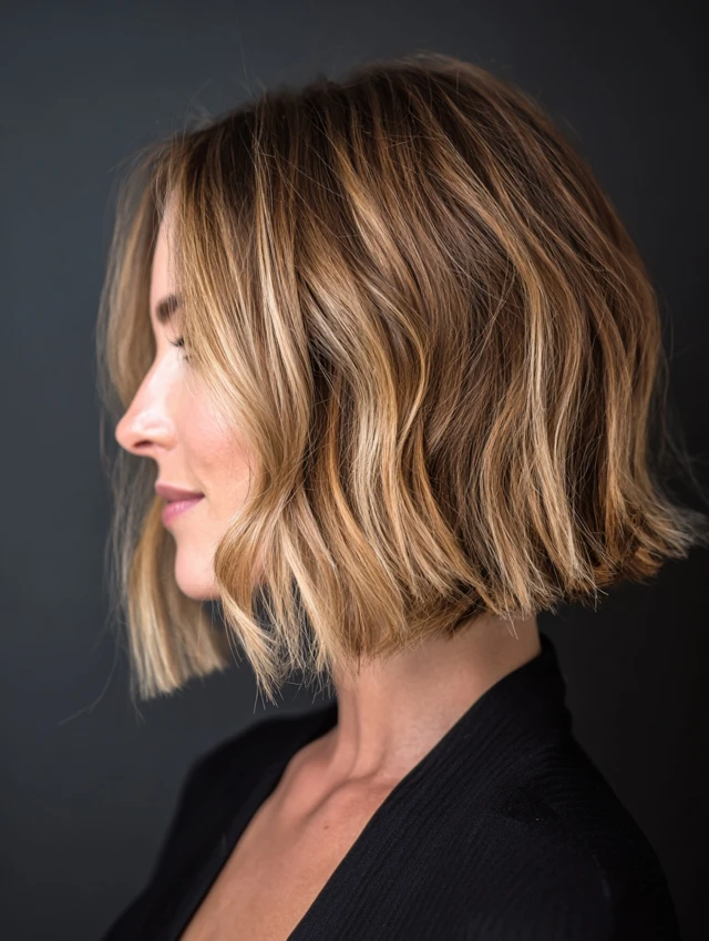 Why It Works: Soft and flattering, this cut frames the face while the warm blonde tone adds glow.