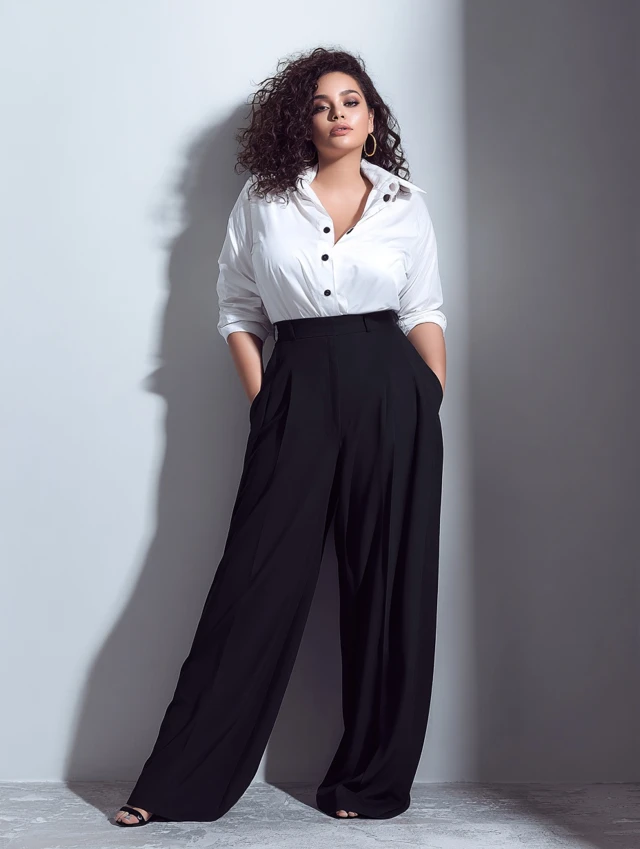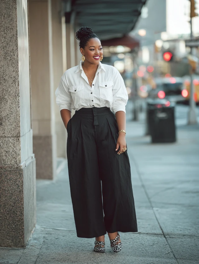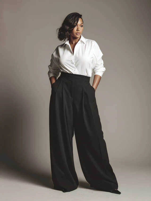 Why It Works: Crisp, clean, and timeless. The wide-leg cut elongates the frame, while the shirt keeps it structured.