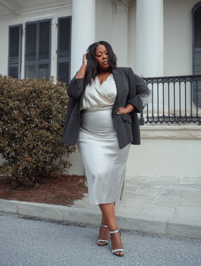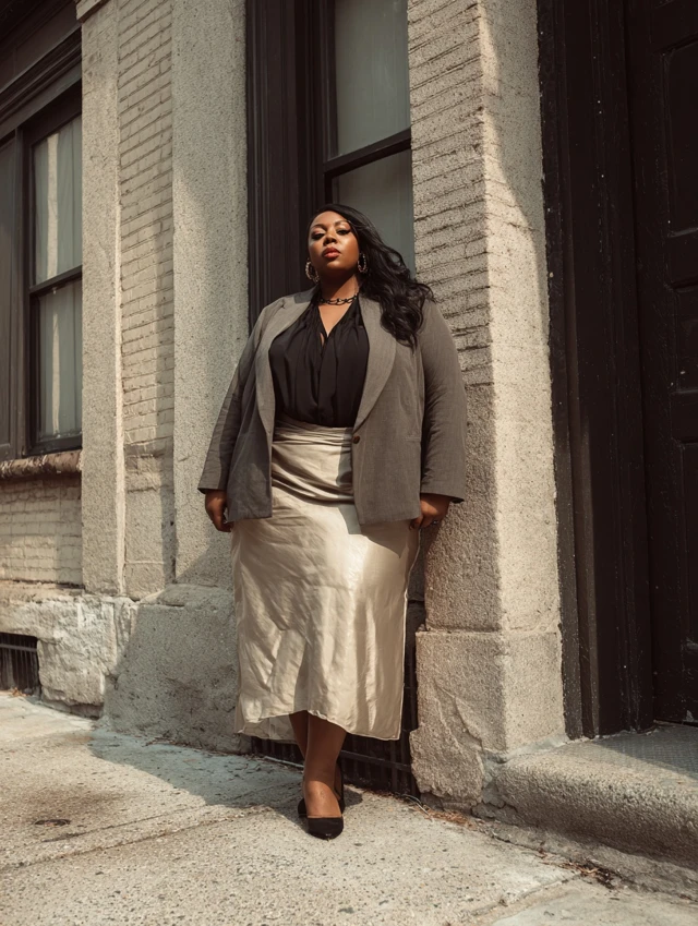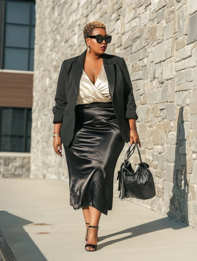 Why It Works: The sleek slip skirt contrasts perfectly with a tailored blazer, giving a chic, balanced look.