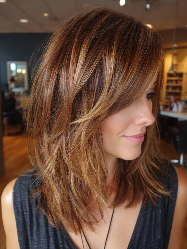 Whether it’s soft balayage, golden ribbons, caramel streaks, or bold contrasting tones, highlights add that instant touch of light and luxury. Medium-length hair gives the ideal canvas—not too short for contrast, not too long to lose definition.