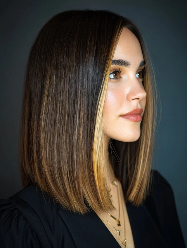Why It Works: The sleek lines of a lob let the highlights pop—clean, simple, and ultra-modern.