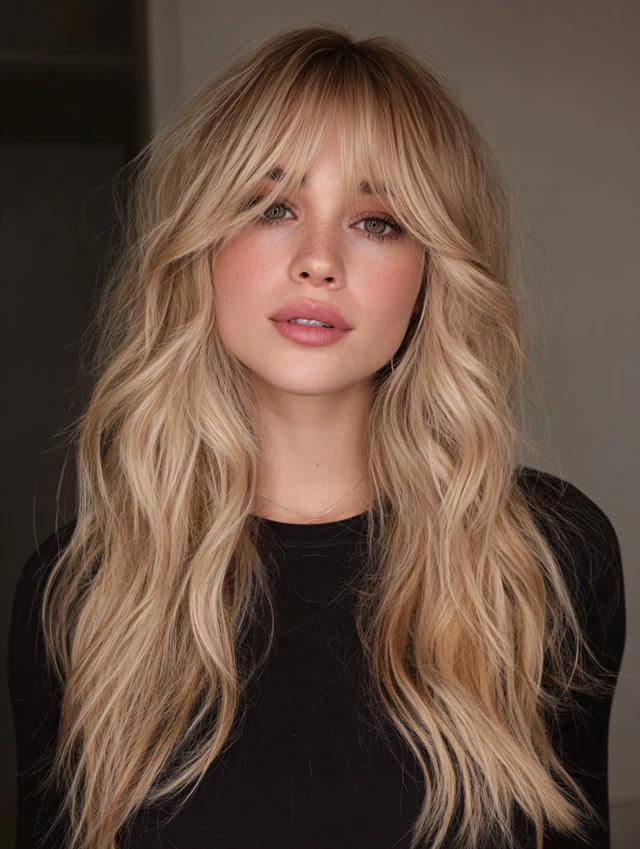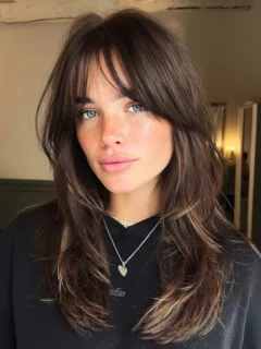 Why It Works: Curtain bangs add a chic, trendy twist while blending seamlessly into the layers for a cohesive, face-framing look.