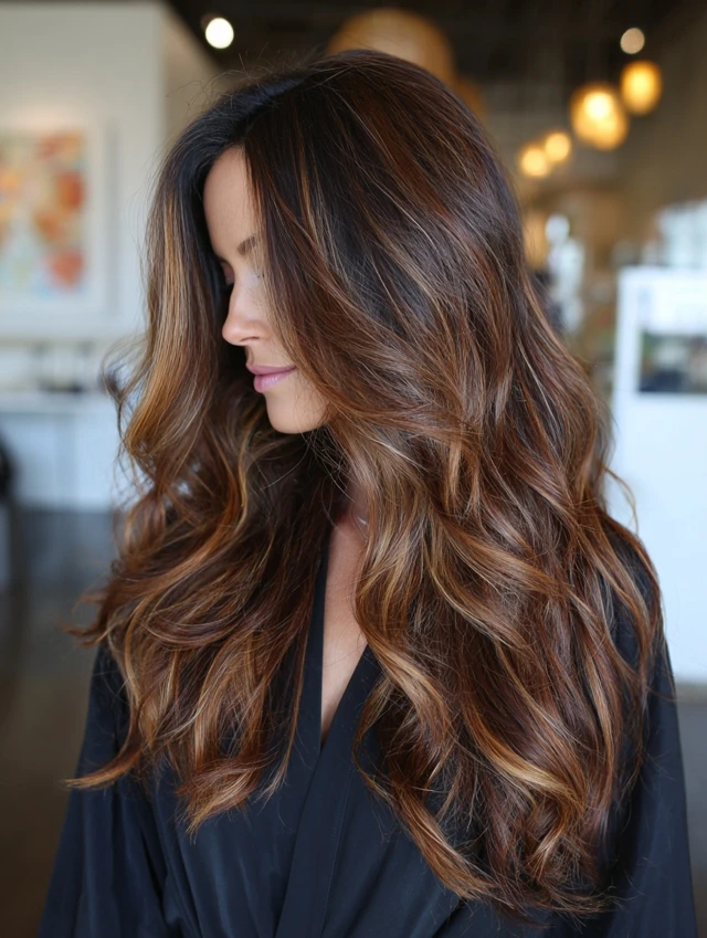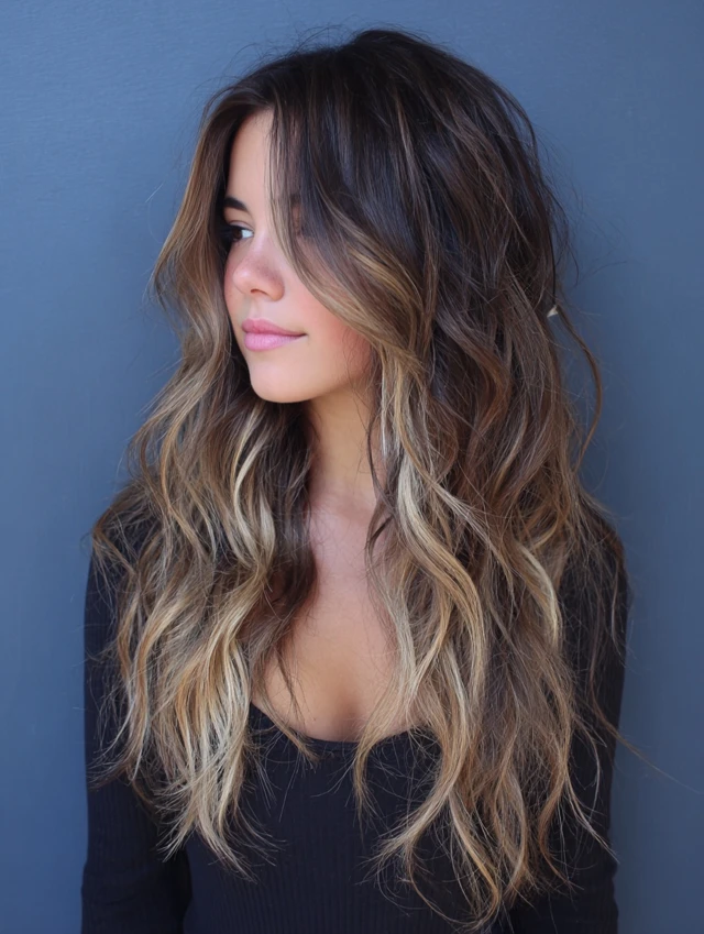 3. Wavy Long Layers with Balayage Highlights