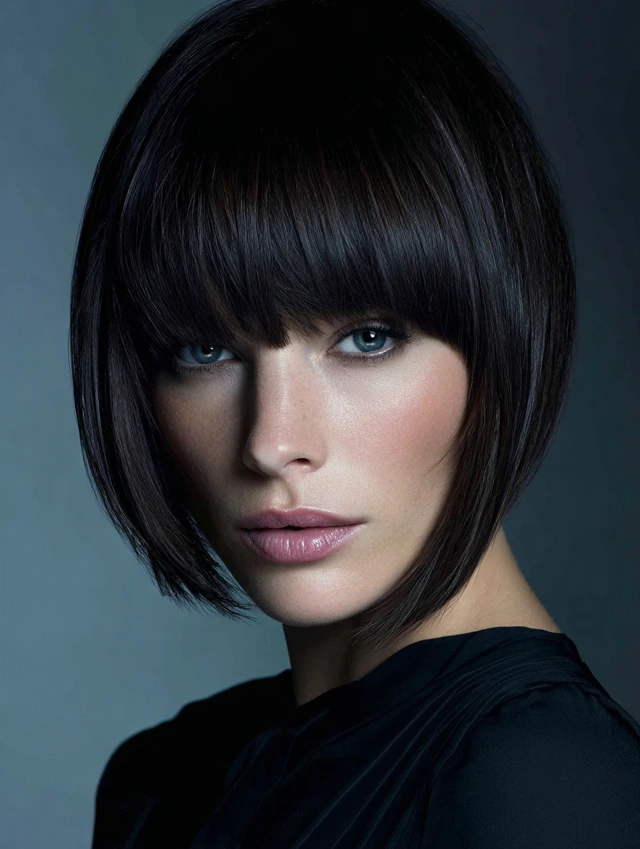 Why It Works: The clean, angled cut elongates the face while the soft bangs add balance and movement.