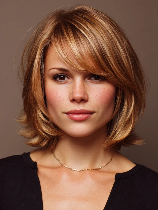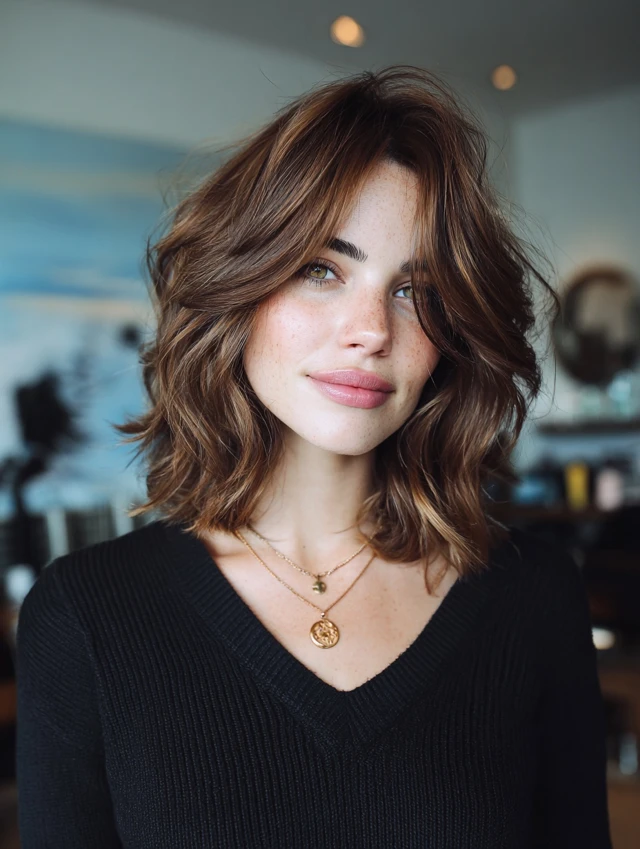 Why It Works: Adds texture and volume without overwhelming your proportions. The feathered ends create movement while accentuating the cheek area.