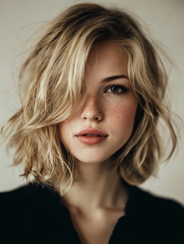 Why It Works: The side bangs break up symmetry slightly, giving the illusion of a more dynamic, lifted shape.