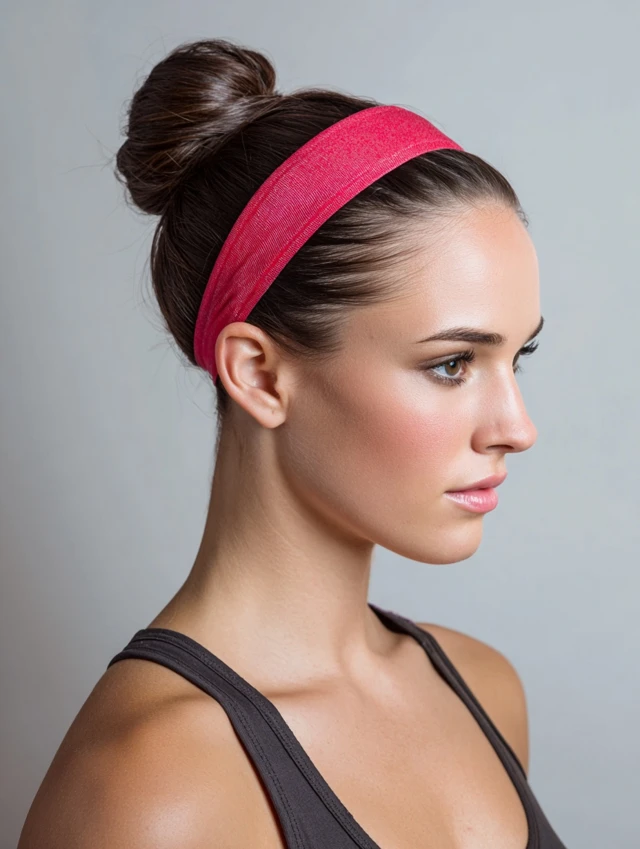 A low bun keeps the bulk of hair contained while a headband prevents stray strands from hitting your face.