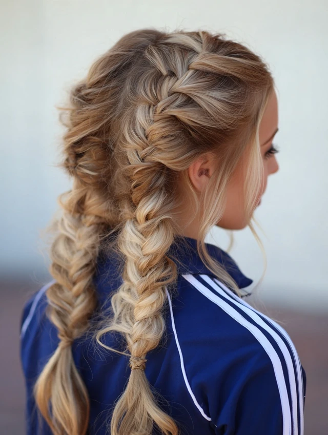 Double braids keep hair secure and reduce tangling during fast-paced soccer sessions.
