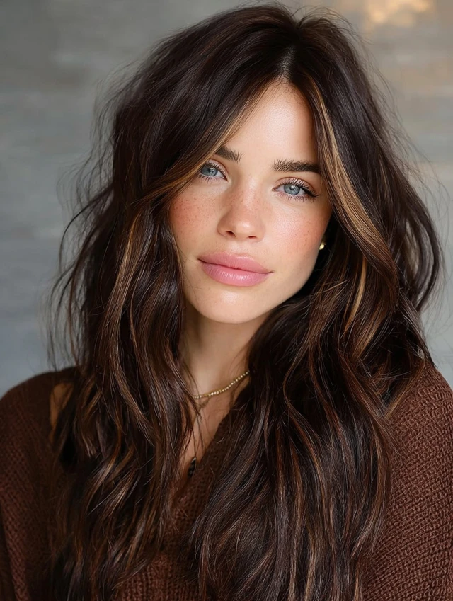 Caramel highlights melt into deep brown hair, adding warmth and subtle dimension perfect for autumn.