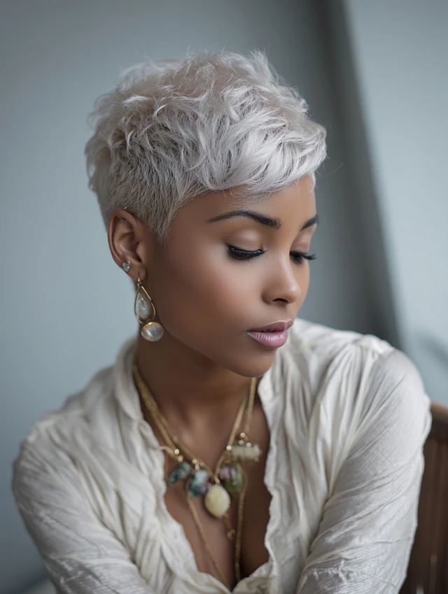 A pixie cut with a silk press emphasizes facial features while keeping hair sleek and stylish.