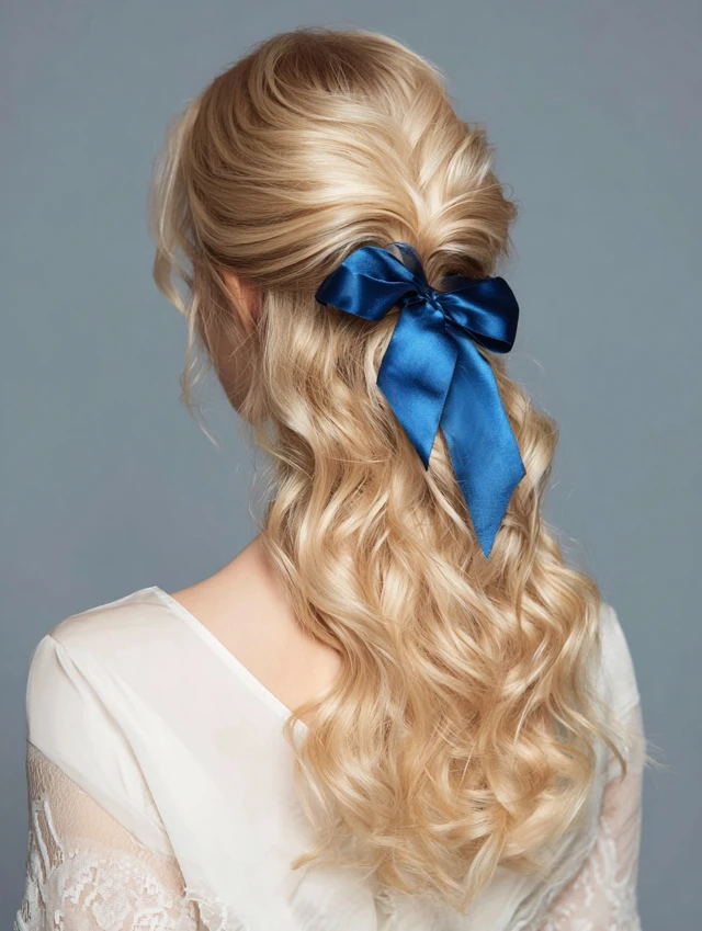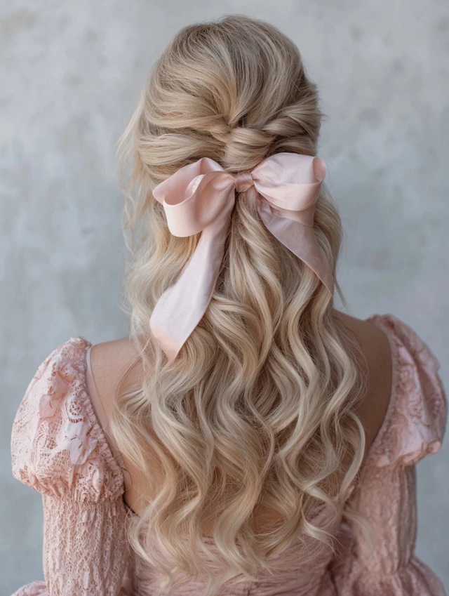 A half-up style feels playful and romantic, especially when tied with a ribbon or bow.