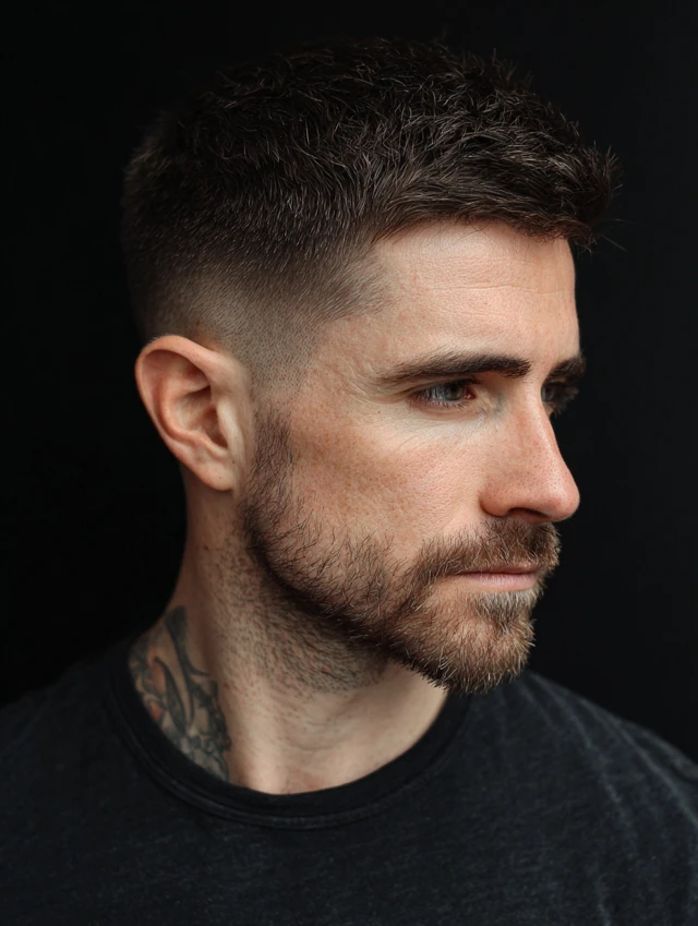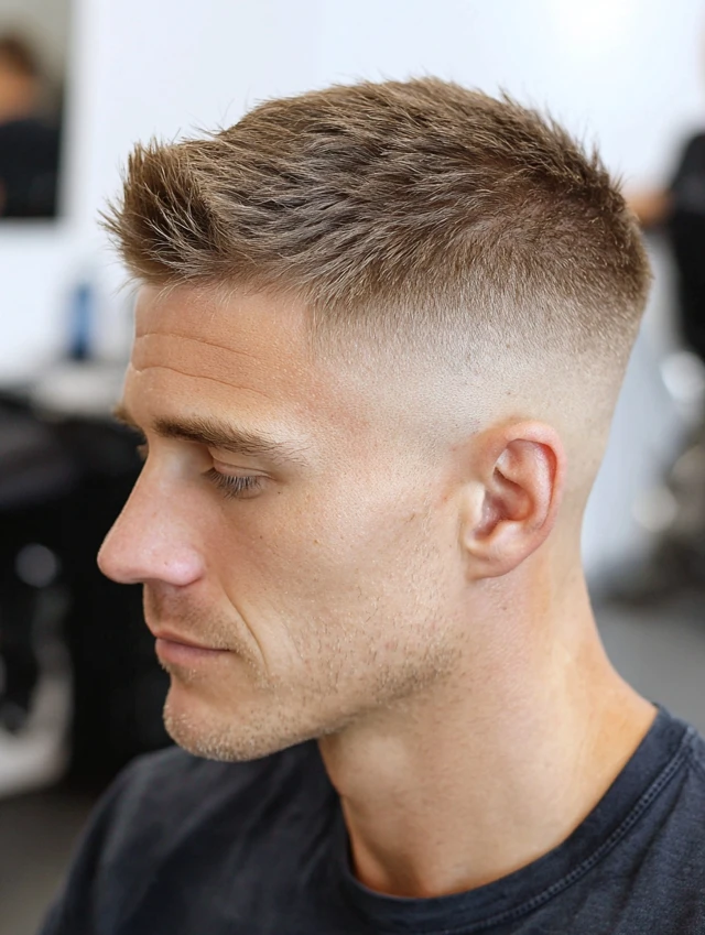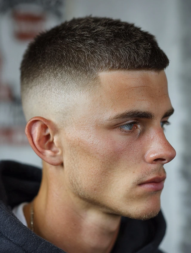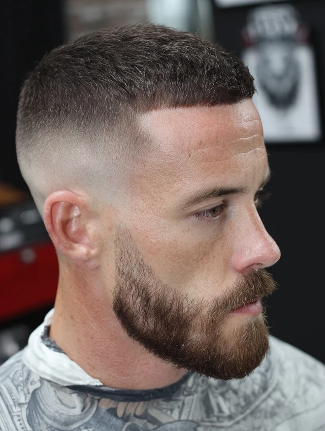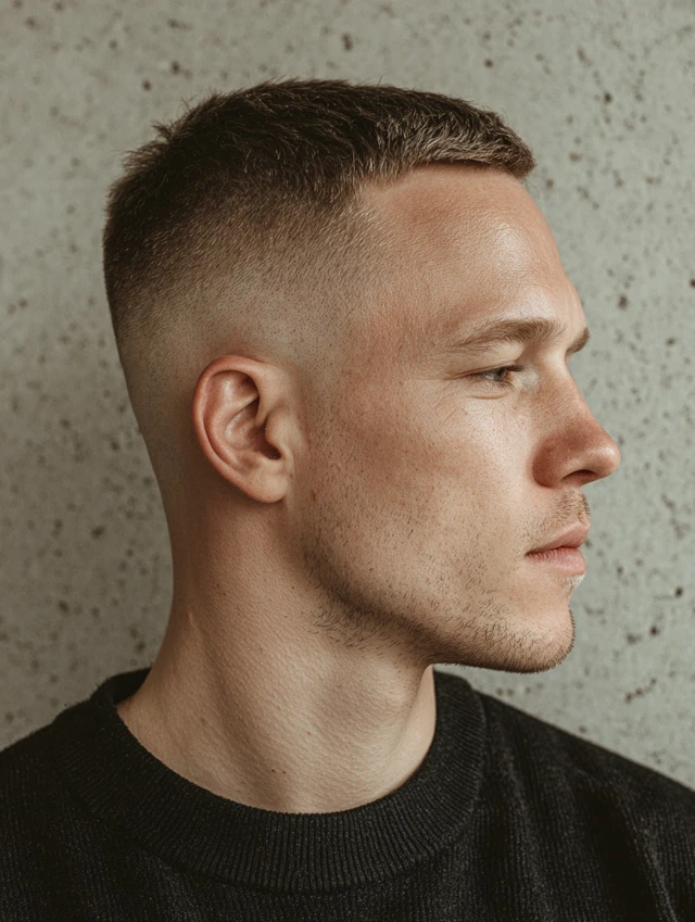 A skin fade adds a sharp, modern edge to the classic crew cut, creating high contrast and a crisp silhouette.