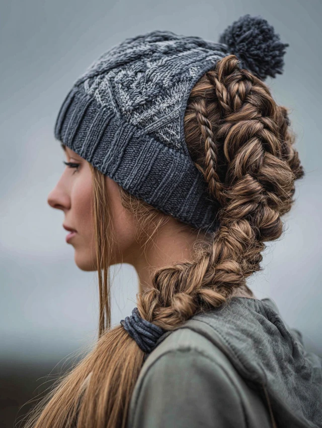 A ponytail braid keeps hair sleek under a beanie while adding stylish length and texture.
