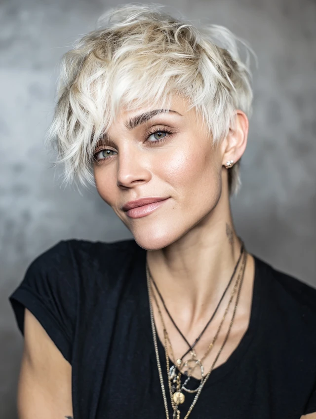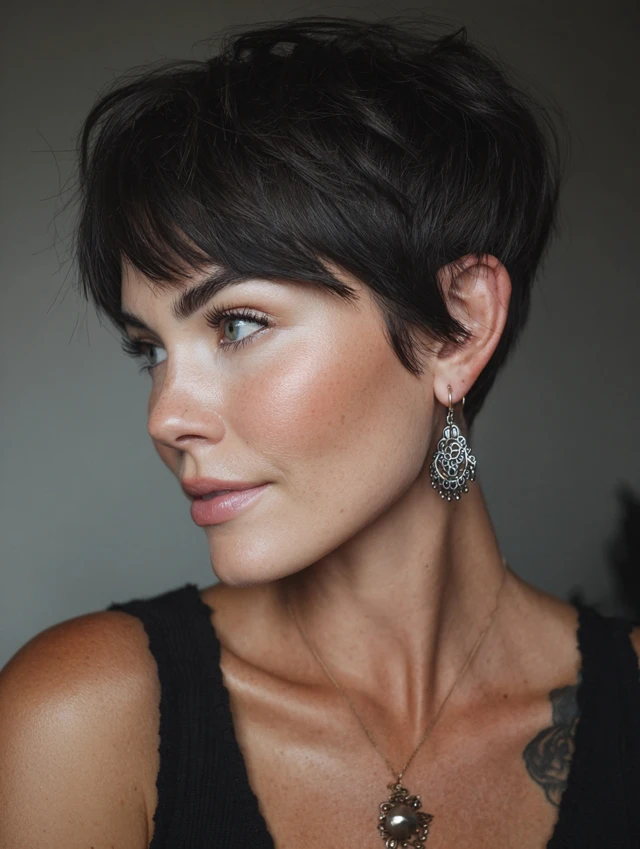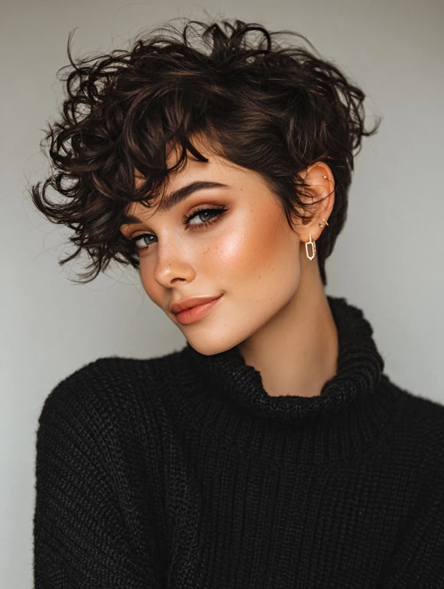 A pixie highlights curls at the top while keeping sides light and airy, giving the illusion of fullness.