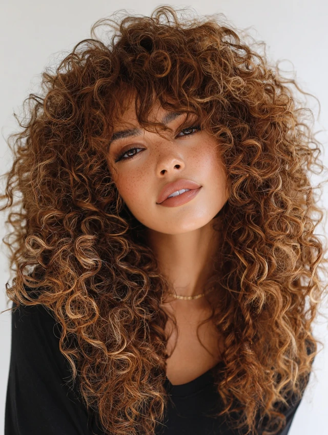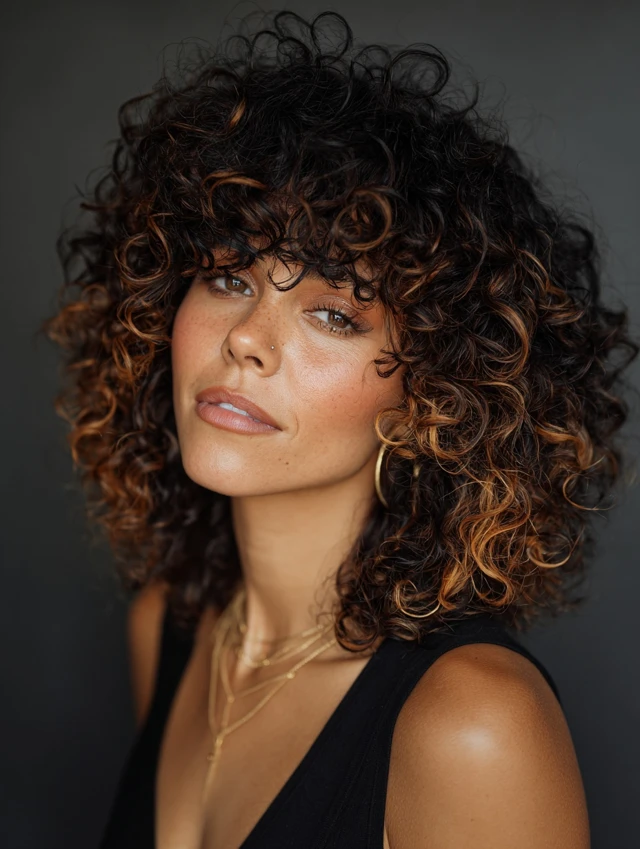 Subtle highlights in bangs and curls add depth and dimension, enhancing curl definition and facial framing.