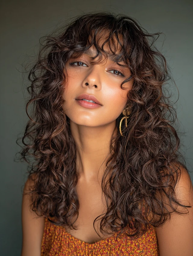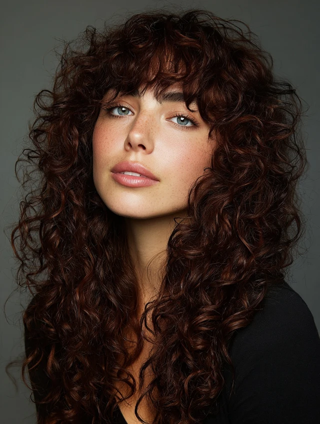 Long curly hair with bangs is a striking way to combine natural texture with a soft, face-framing feature. Bangs add dimension, highlight the eyes, and create a balanced look that enhances curls while keeping hair playful and stylish.