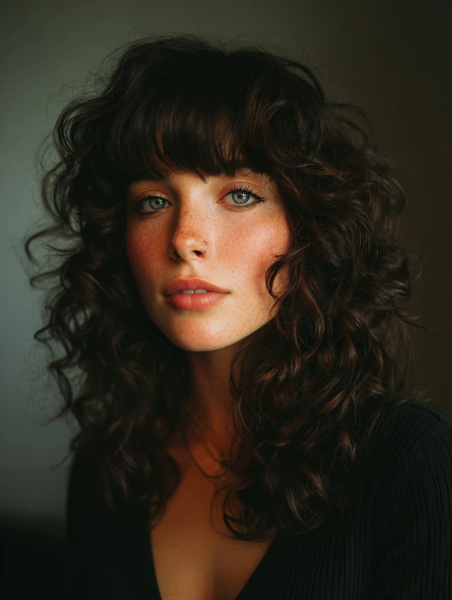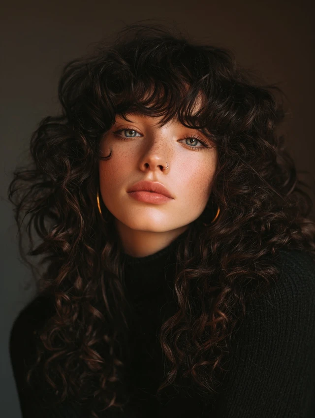 Thick bangs complement voluminous curls, creating a bold, dramatic look.