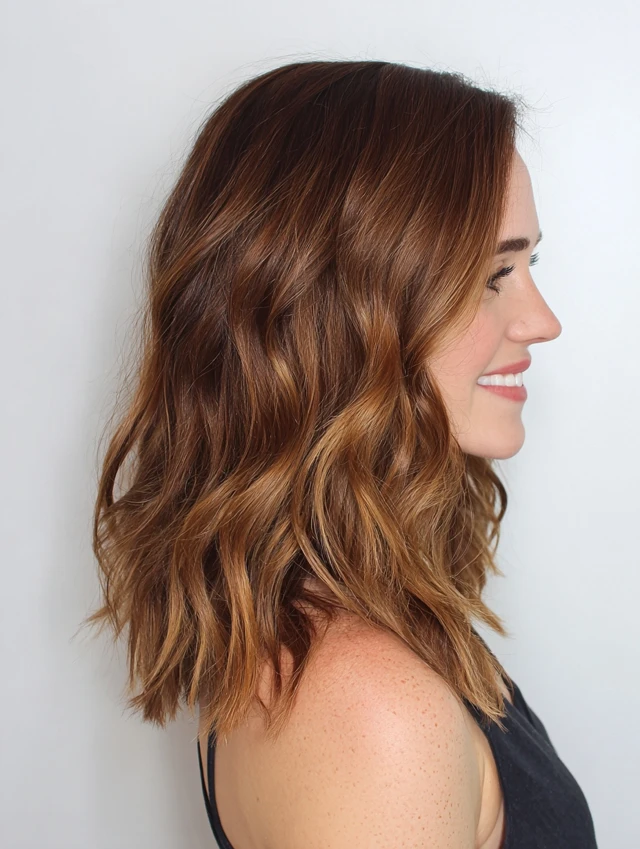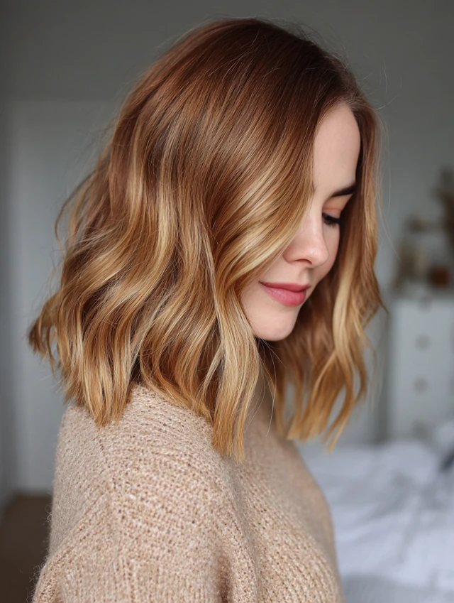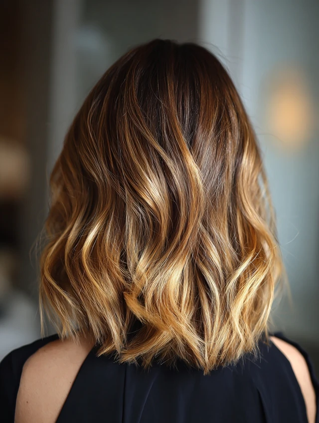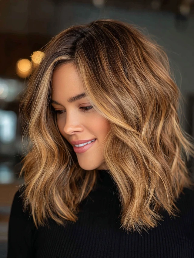 Warm honey tones blended into a longer bob create natural dimension and depth.