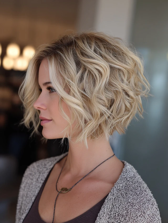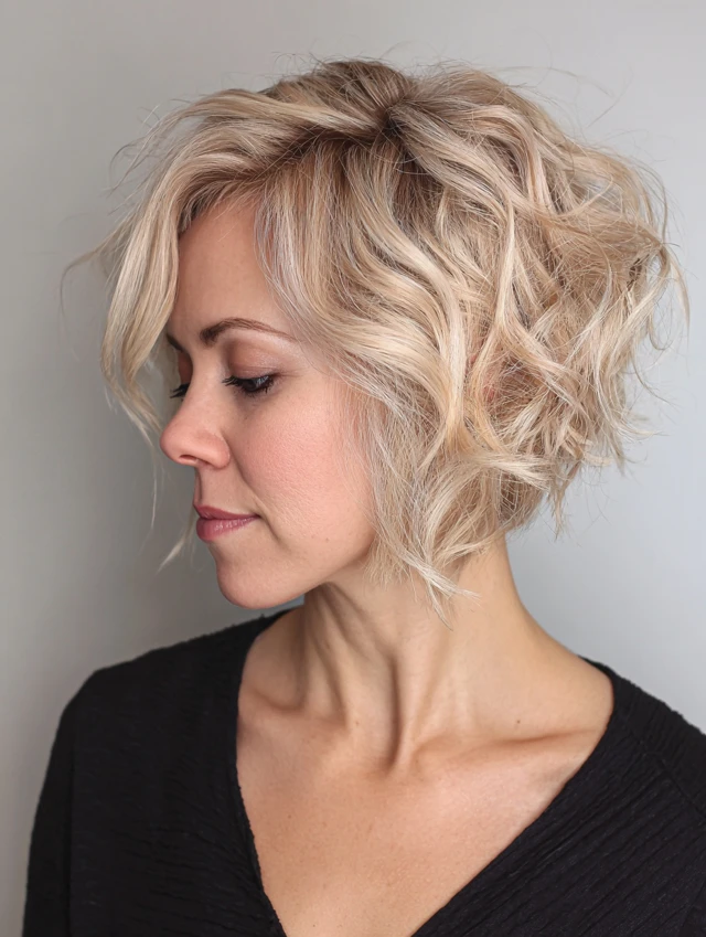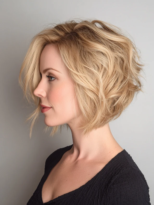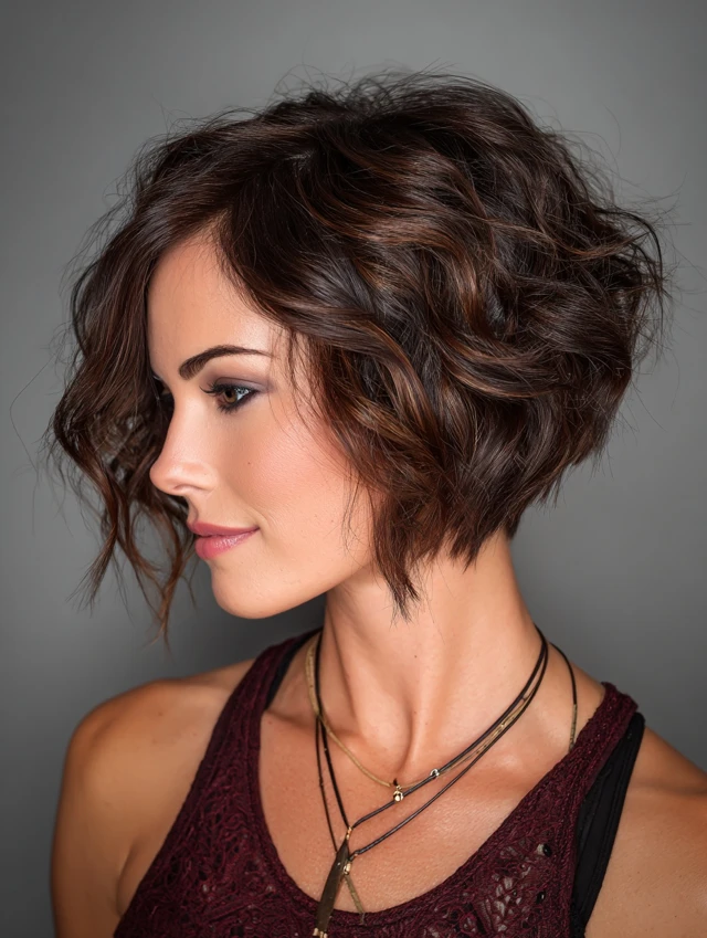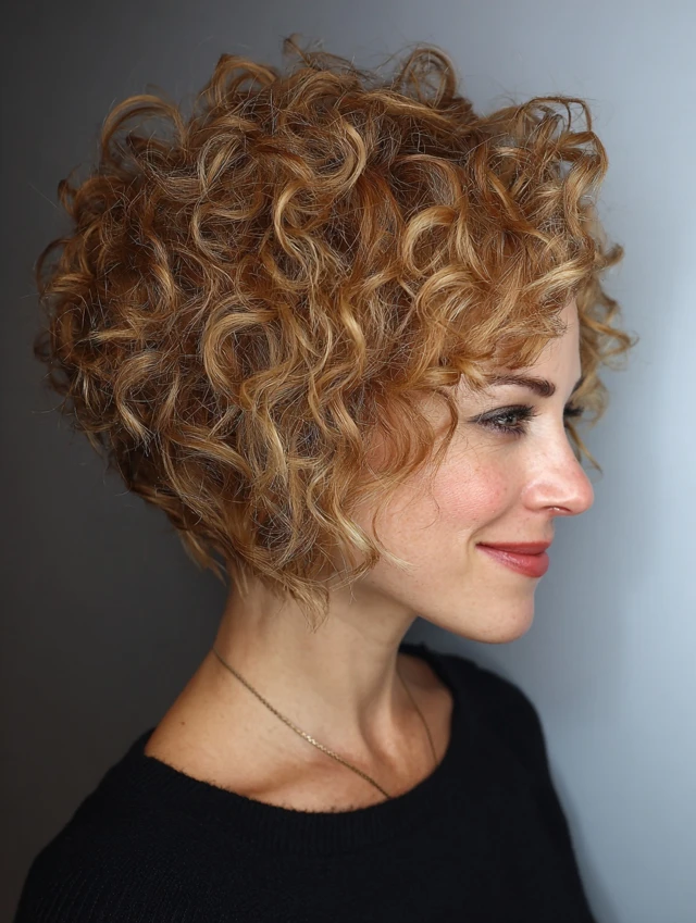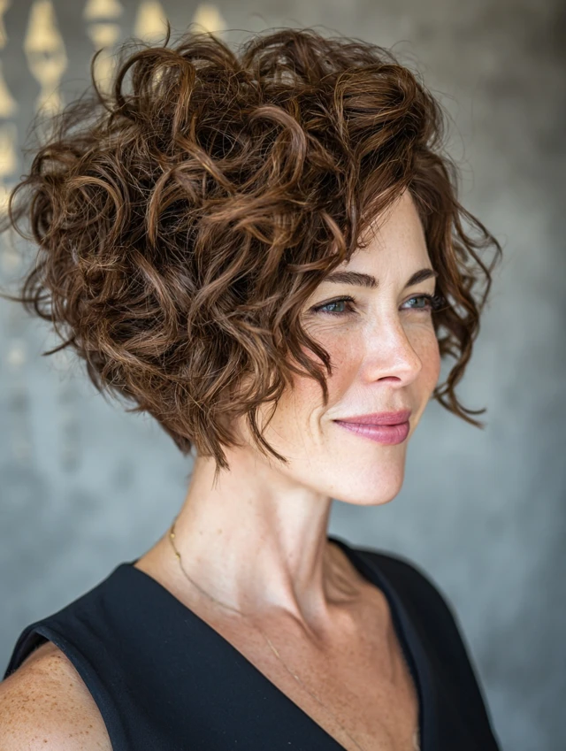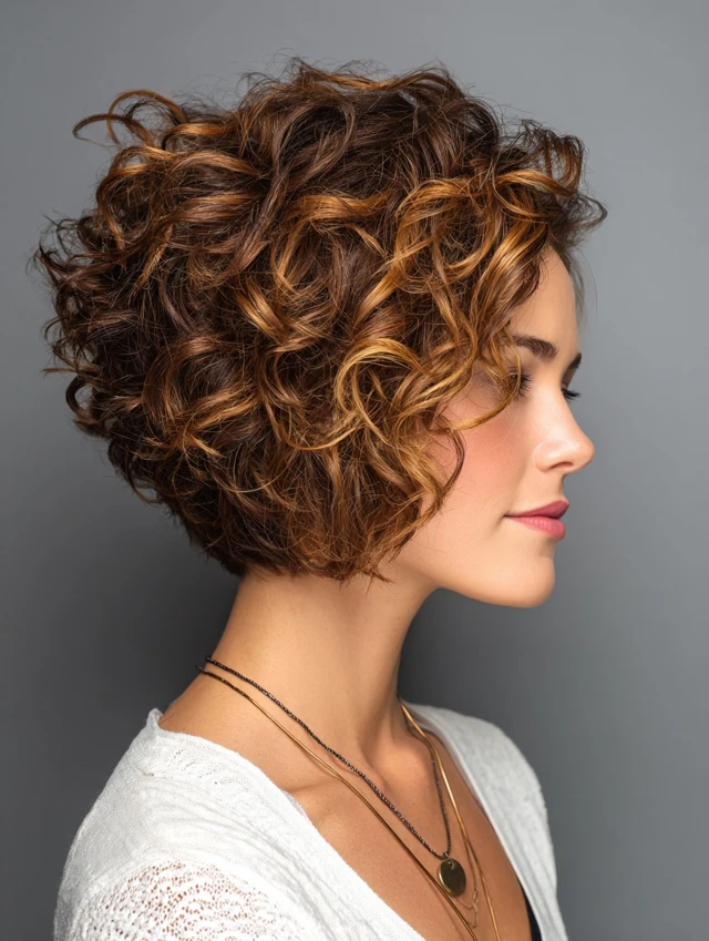 Why It Works: Curls bring volume and definition to the stacked shape while maintaining softness.