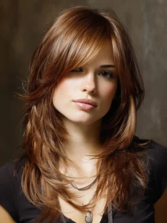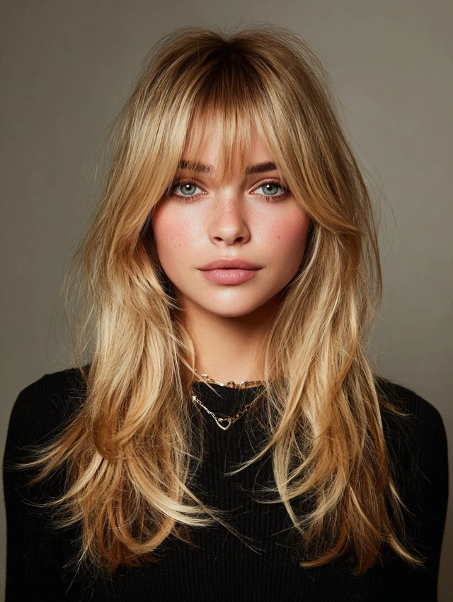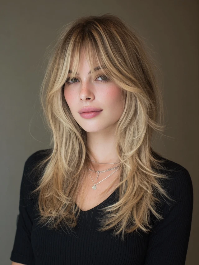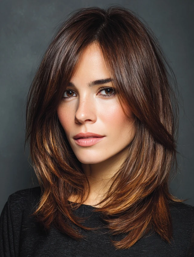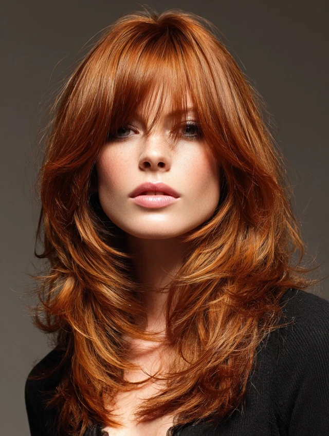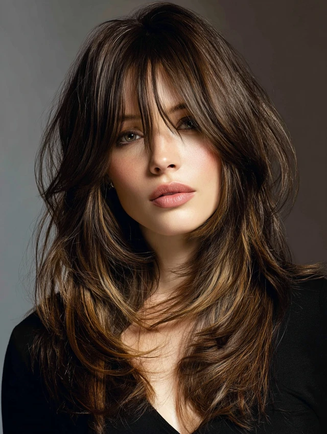 Curtain bangs open up the forehead and blend smoothly into layers.